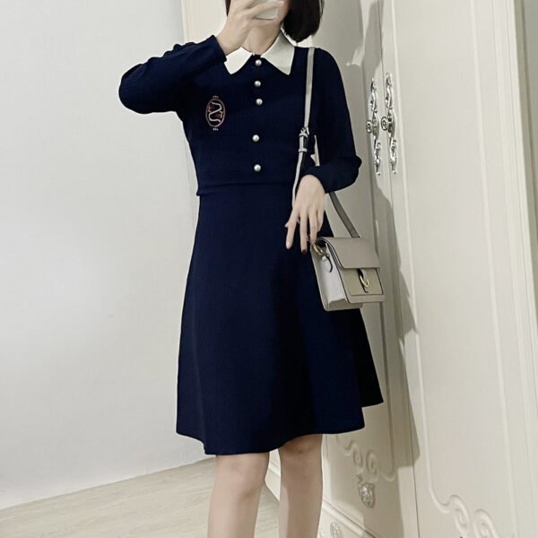 College-style POLO collar embroidered French-style high-waisted long-sleeved slim-fitting knitted base dress for Korean style autumn-winter women