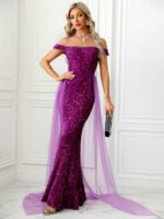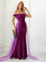 2025 new cross-border best-selling European women’s clothing – V-neck backless off-the-shoulder floor-length net-sheen decorated dress