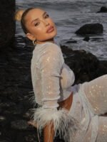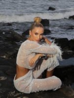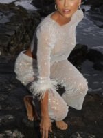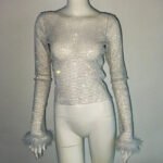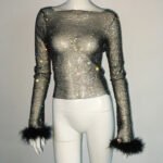 Cross-border European-style high-end women’s water droplet sequin mesh square-neck long-sleeved T-shirt women’s luxury ostrich feather full-diamond T-shirt top