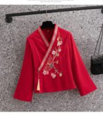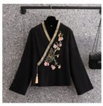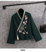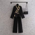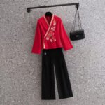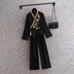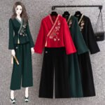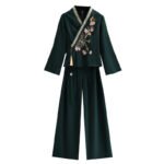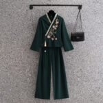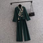 Spring and autumn women’s embroidered velvet retro stand-up collar Chinese-style cheongsam and pants set – new Chinese-style health preservation work clothes for women