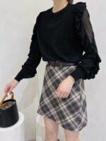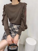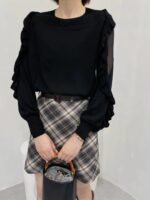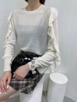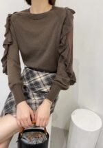 Spring Autumn Women’s New Korean-style Simple Solid Color Versatile Slit Sleeve T-Shirt With Collar and Organza Lace Edging on Sleeves