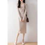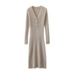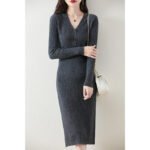 V-neck style slimming wool knitted dress – 24th autumn/winter new design, fitted mid-length, full-skirted wool long dress